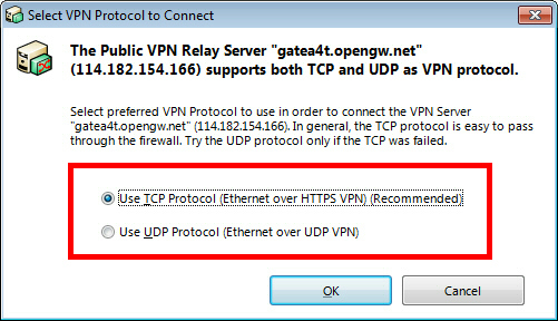If the selected VPN Gate Server supports both TCP and UDP protocols, the above screen will appear. Choose either TCP or UDP on the screen.